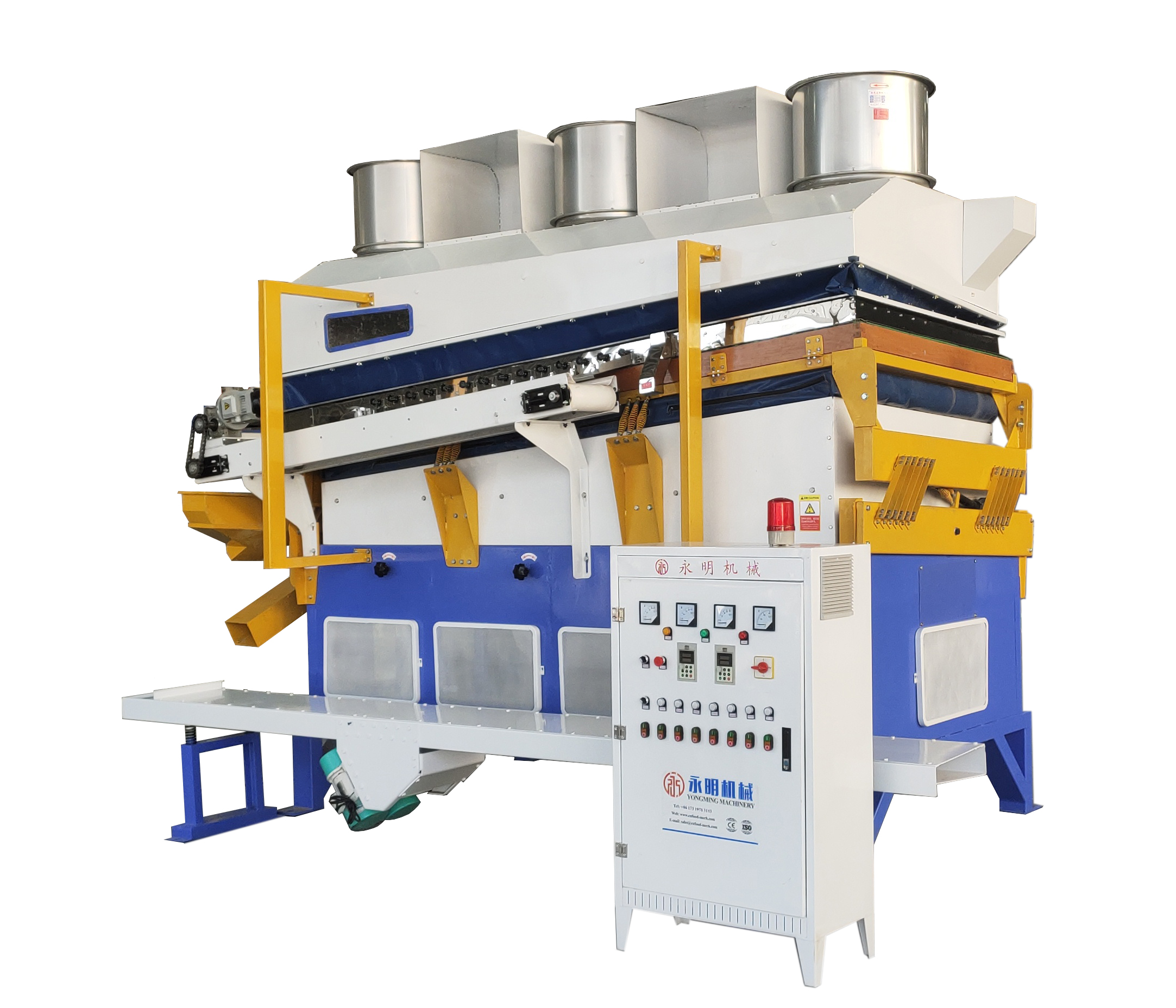 正、負壓比重機(又被稱為正負壓比輕重篩、懸浮正負壓比輕重篩、懸浮正負壓比輕重機、偏心軸正負壓比輕重篩、偏心軸正負壓比輕重機、除去空癟籽(子)正負壓比輕重篩、除去空癟籽(子)正負壓比輕重機、除去空癟殼正負壓比輕重篩、除去空癟殼正負壓比輕重機等),是利用獨有物理特性適用于篩選體積相同而重量不同的物料(葵花籽、籽仁、種子等農(nóng)產(chǎn)品),可去除秸桿、樹枝、石子、未成熟料、蟲蛀料及破碎原料等。該產(chǎn)品利用正壓吹附或負壓吸附原理,根據(jù)顆粒狀物料在流態(tài)化過程中產(chǎn)生的比重偏析現(xiàn)象。通過調(diào)整風壓、振幅等參數(shù),使物料間相互置換產(chǎn)生分層,比重大的向下部沉降,比重小的向上部漂移,待進入落料區(qū)后,可按要求將比重不同的物料從不同的出料口排出。同時比重機另設有去石口,可以將物料中的石子有效分離出來,所以被該設備加工后的原料可滿足不同的千粒重或整齊度要求。此外,該設備與配套脈沖除塵器搭配,連接軸流風機,做到效率高的吸附選別;該產(chǎn)品可單一使用,或搭配其他設備(如去石機,分級篩等)效果更佳。