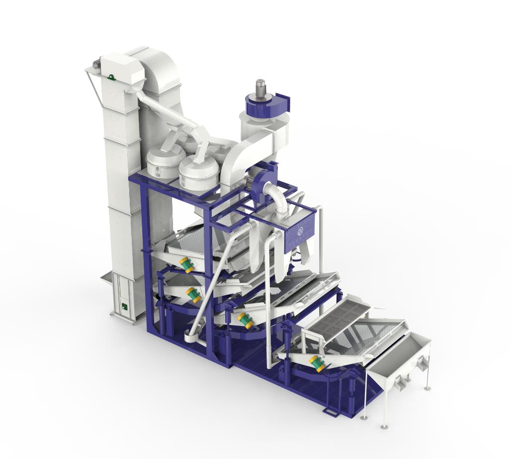 KTF5-3000型葵花脫殼分選機是我公司擁有自主知識產(chǎn)權(quán)的產(chǎn)品,具有較高的市場占有率。該產(chǎn)品通過立式提升機、脫殼系統(tǒng)及專業(yè)的分離系統(tǒng),使產(chǎn)品擁有更高整仁率和更高生產(chǎn)量。原料進入脫殼器中,準確撞擊產(chǎn)生破殼,處理后的仁、皮和未脫殼顆粒進入懸浮皮籽分離器中,并進行準確的分離篩選;同時,通過旋風除塵器將皮和塵土排出;四臺振動篩依次對仁和未脫殼顆粒進行分離;未脫殼顆粒將回到回料脫殼器中進行二次脫殼;終成品進入儲料箱。此外,該產(chǎn)品采用立式提升機輸送原料,在增加產(chǎn)量的基礎(chǔ)上,避免了原料堵塞;PLC電氣化控制系統(tǒng)可以便捷的進行設(shè)備的全面控制及細微調(diào)整,從而使得該設(shè)備更加智能化。